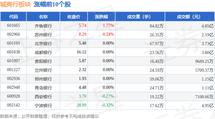 | 代码 | 名称 | 收盘价 | 涨跌幅 | 成交量(手) | 成交额(元) | | --- | --- | --- | --- | --- | --- | | 601187 | 厦门银行 | 7.42 | -1.85% | 14.08万 | 1.04亿 | | 600928 | 西安银行 | 3.71 | -1.07% | 18.10万 | 6755.34万 | | 601963 | 重庆银行 | 10.90 | -0.82% | 12.16万 | 1.32亿 | | 601169 | 北京银行 | 5.48 | -0.72% | 121.96万 | 6.70亿 | | 6000009 | 南京银行 | 11.52 | -0.60% | 29.57万 | 3.41 乙 | | 002936 | 郑州银行 | 1.93 | -0.52% | 56.10万 | 1.09亿 | | 601577 | 长沙银行 | 9.74 | -0.51% | 10.98万 | 1.07亿 | | 601838 | 成都银行 | 16.12 | -0.31% | 29.85万 | 4.81亿 | | 002948 | 青岛银行 ...