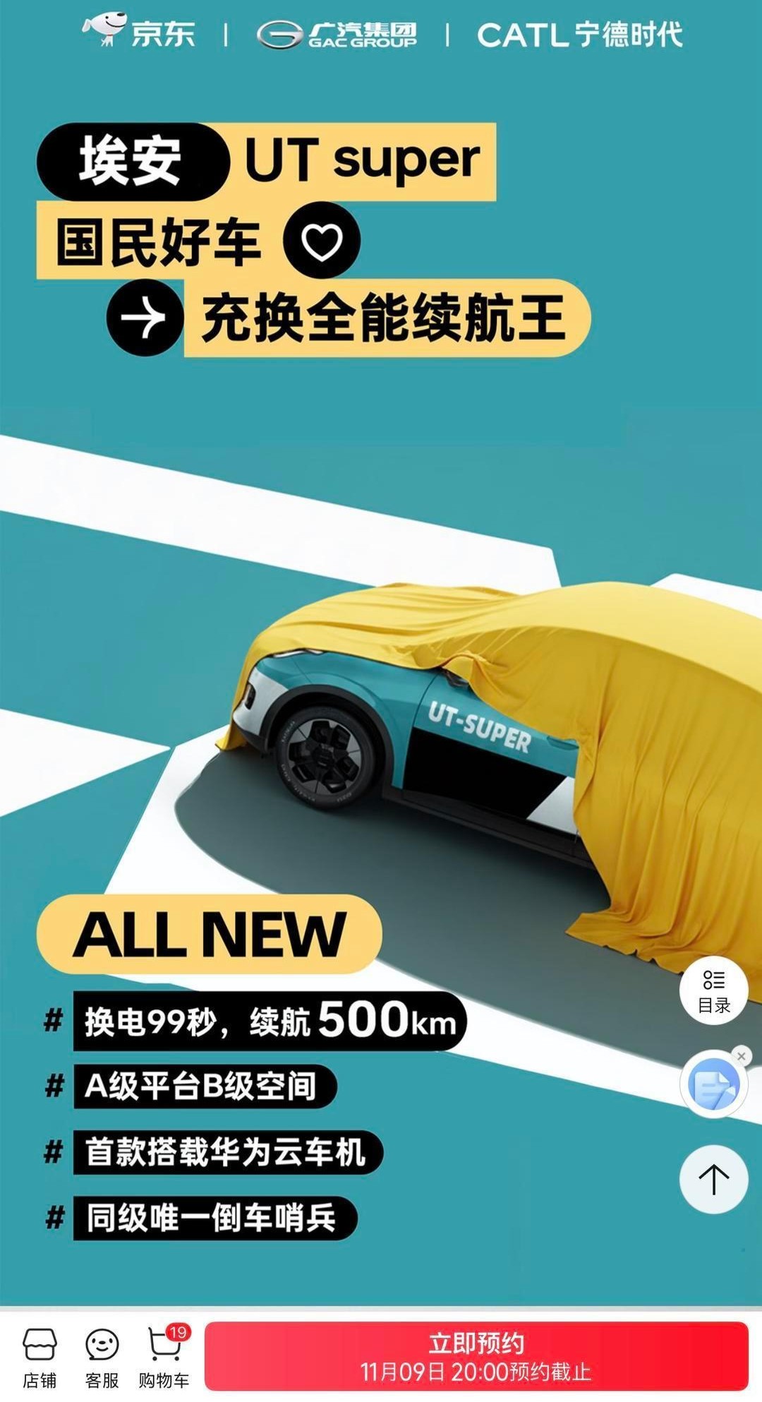 据微博"京东汽车"10月23日消息,京东联合宁德时代、广汽集团推出的"国民好车"车型名称正式发布——"埃安UT super"。据介绍,该车搭载华为云 车机技术,配置了宁德时代巧克力换电块,使用了500KM续航大电池,可支持99秒极速换电。 社交媒体截图 10月14日,京东在11.11惊喜开放日上宣布,京东汽车宣布联合宁德时代旗下的时代电服和广汽集团共同推出一款"国民好车",创新打造一站式配齐 的汽车消费新模式。该项目将通过整合京东在用户洞察和买车、养车等方面的优势资源,以及广汽整车制造能力和宁德时代的电池技术及换电生 态,在安全性、电池与补能、用车配套服务、价格等方面实现突破。 10月15日,京东先后宣布与长安汽车、宁德时代深化战略合作:与长安汽车将推进乘用车、摩托车全渠道营销,共建线下服务网络,探索智慧物流 车及新能源无人车型开发;与宁德时代则聚焦电池后市场,京东养车网络将上线宁德时代"巧克力换电"官方直销渠道,推广车电分离模式,并在钠 电技术、城配物流电动化等领域展开合作。 10月20日,京东在车辆预约页面悄然更新了部分数据信息,主要以车身制造工艺及数据为主。 据介绍,车身结构方面,该车采用高强度笼式设计 ...
