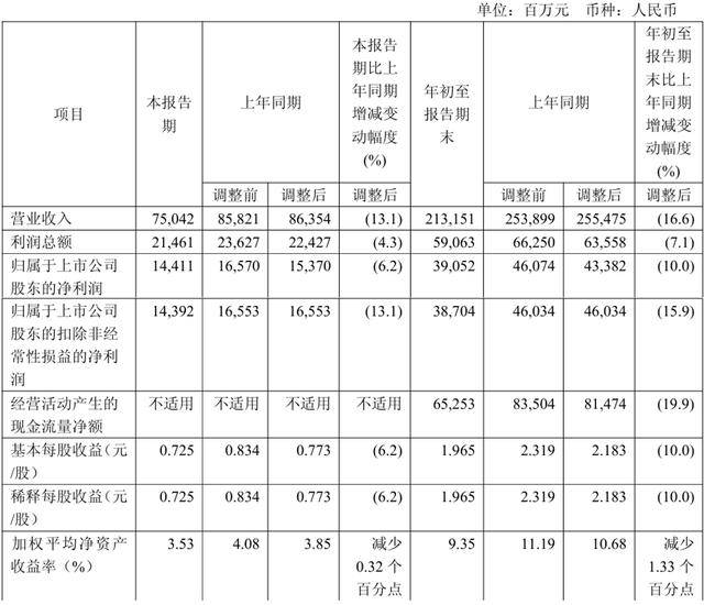 重点要闻 中国神华前三季度净利润同比下降10% 中国神华(601088.SH)公布2025年第三季度报告。2025年第三季度公司实现营业收入750亿元,同比减少 13.1%,归属于上市公司股东的净利润144.11亿元,同比下降6.2%;前三季度实现营业收入2131.51亿 元,同比减少16.6%,归属于上市公司股东的净利润390.52亿元,同比下降10%。 | | | | | | | | 4:10: HV : VM : VM : | | | --- | --- | --- | --- | --- | --- | --- | --- | --- | | 项目 | 本报告 期 | | 上年同期 | 本报告 期比上 年同期 增减变 动幅度 | 年初至 报告期 末 | 上年同期 | | 年初至 报告期 末比上 年同期 增减变 | | | | | | | | | | 动幅度 | | | | | | (%) | | | | (%) | | | | 调整前 | 调整后 | 调整后 | | 调整前 | 调整后 | 调整后 | | 营业收入 | 75,042 | 85,821 | 86,354 | (13.1) | 213.1 ...