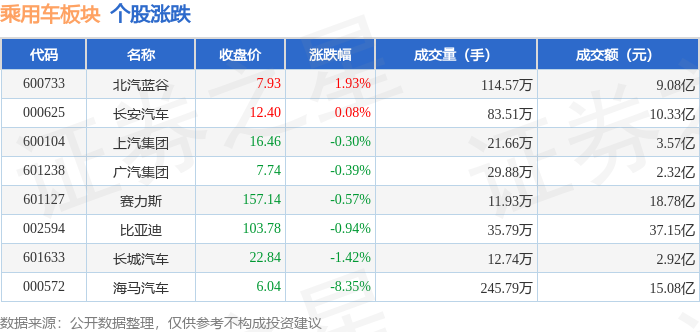 板块整体表现 - 10月22日乘用车板块整体下跌0.67%,表现弱于上证指数(下跌0.07%)和深证成指(下跌0.62%)[1] - 板块内个股普遍下跌,海马汽车以8.35%的跌幅领跌[1] - 板块主力资金净流出13.48亿元,而游资和散户资金分别净流入4.99亿元和8.49亿元[1] 个股价格与成交 - 北汽蓝谷是板块中唯一上涨的个股,涨幅为1.93%,收盘价7.93元,成交额9.08亿元[1] - 长安汽车微涨0.08%,收盘价12.40元,成交额10.33亿元[1] - 海马汽车跌幅最大,为8.35%,收盘价6.04元,但成交量最高,达245.79万手,成交额15.08亿元[1] - 比亚迪下跌0.94%,收盘价103.78元,成交额37.15亿元,为板块最高[1] - 赛力斯下跌0.57%,收盘价157.14元,成交额18.78亿元[1] 个股资金流向 - 比亚迪主力资金净流出规模最大,达10.27亿元,主力净占比为-27.64%[2] - 海马汽车主力资金净流出2.64亿元,主力净占比为-17.49%[2] - 北汽蓝谷是唯一获得主力资金净流入的个股,净流入1.42亿元,主力净占比15.65%[2] - 比亚迪同时获得最大规模的游资净流入,为3.79亿元,游资净占比10.20%[2] - 比亚迪也获得最大规模的散户净流入,达6.48亿元,散户净占比17.44%[2]
