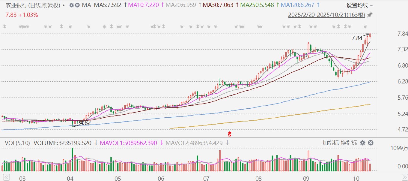 10月21日,农业银行走出13连阳,股价再创历史新高。按照最新股价计算,其A股总市值已突破2.76万 亿元。2025年以来,农行股价涨幅超50%,显著跑赢银行板块整体表现。 近期,农业银行股价频创新高,引领银行股的反弹行情。 近期,以农业银行为代表,银行股正迎来估值修复的积极信号。上周,农业银行A股市净率(PB)站上 1倍关口,打破了国有银行长期"破净"的局面。分析人士认为,当前,优质资产的高股息率叠加稳健的 业绩表现,成为吸引资金流入的重要优势。当下,银行等红利资产正在收获新一轮"价值发现"。 农业银行走出13连阳 再创历史新高 10月17日,农业银行A股市净率(PB)自2018年3月以来首次回到1倍以上,这一突破也打破了国有银行 长期"破净"(即市净率低于1倍)的局面,备受市场关注。 农业银行缘何走势如此强劲?对此,分析人士认为,一方面,当下市场环境中,优质资产的高股息率成 为吸引资本流入的重要优势;另一方面,优质的业绩表现,作为核心支撑,是农业银行股价强势的主要 驱动。 兴业证券认为,近期市场风格发生变化,部分资金已开始向银行回流。从历史经验看,银行板块在四季 度上涨概率较高,当前银行板块股息率重回高位 ...