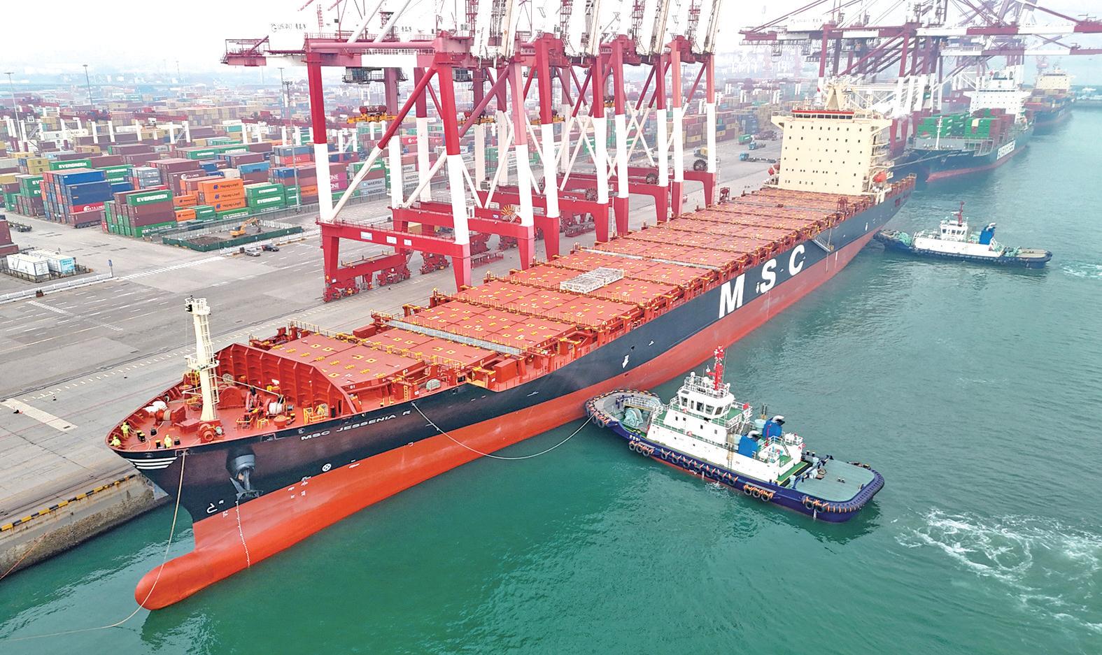 1月4日,地中海航运澳洲新航线首航船舶"地中海杰西尼亚"轮停靠山东港口青岛港,标志着该港2026年首条外贸直航航线正式开通。该航线直 连澳大利亚布里斯班与悉尼,构建起"中国北方—大洋洲"高效物流新通道。作为北方航线最密集的港口,青岛港目前拥有近240条外贸航线,联通 全球180多个国家和地区的700多个港口。张进刚 摄 ...
