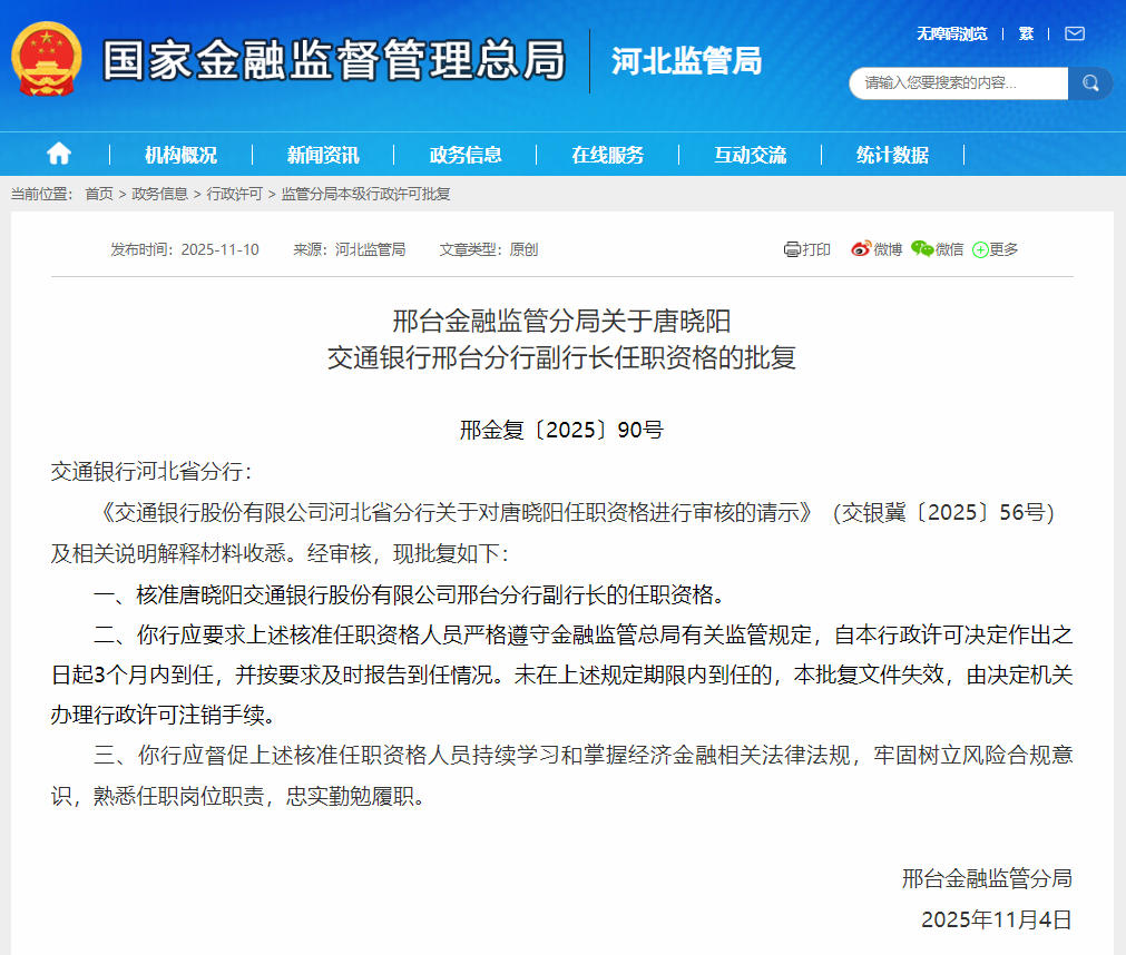 据国家金融监督管理总局河北监管局的批复文件显示,邢台金融监管分局核准唐晓阳交通银行邢台分行副行长的任职资格。 图源:国家金融监督管理总局网站 ...