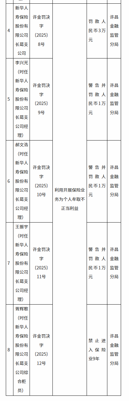 | 寿保险 | | | 禁止进 | | | | | | --- | --- | --- | --- | --- | --- | --- | --- | | (时任 新华人 | 许金罚决 | 许昌 | | 胥辉歌 | 理) | 公司经 | XWX1 | | 股份有 | 字 | 金融 | | | | | | | 8 | | 入保险 | | | | | | | 限公司 | (2025) | 监管 | | | | | | | 长葛支 | 12号 | 业9年 分局 | | | | | | | 公司综 | | | | | | | | | 合柜 | | | | | | | | | 员) | | | | | | | | 凤凰网财经讯 10月15日,据国家金融监督管理总局官网消息显示,新华人寿长葛支公司因利用开展保 险业务为个人牟取不正当利益,被罚款3万元。 时任新华人寿长葛支公司经理李兴光、时任新华人寿长葛支公司经理郝文浩、时任新华人寿长葛支公司 经理王振宇,对上述违规行为负有责任,受到警告,并分别被罚款1万元。时任新华人寿长葛支公司综 合柜员胥辉歌,被禁止进入保险业9年。 | | 新华人 寿保险 | 许金罚决 | | | ...