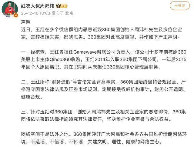 瑞财经 吴文婷12月16日,前360高管"炮轰"周鸿祎,自称帮其做假账至少几十亿一事引发热议。 360公司、周鸿祎相继发布声明回应称,经核查,玉红曾担任Gamewave游戏公司负责人,该公司十多年 前被原360美股上市主体Qihoo360收购。玉红2014年入职360集团下属公司,一年后2015年因个人原因离 职。其在职期间从未担任360集团核心管理层职务。 声明中指出,玉红所称"财务造假"等言论完全背离事实。360集团始终坚持合规经营,严格遵守国家法 律法规及证券市场规则,定期接受权威机构审计,财务公开透明、健康合规。 另外,针对玉红对360集团、创始人周鸿祎及相关企业家的恶意诽谤,360集团将依法采取法律措施追究 其法律责任,坚决维护企业声誉与合法权益。 截至当日收盘时,三六零(601360. SH)报10.86元,跌5.07%,总市值约760.15亿元。 ...