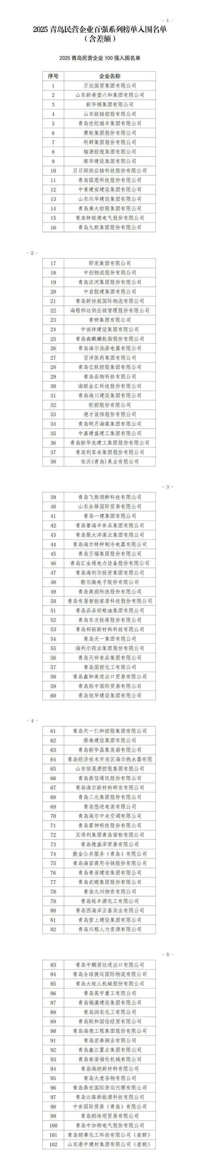 2025青岛百强民企榜单概览 - 榜单由市工商联、发改委等十个部门联合评选发布,依据企业申报、区市推荐、部门审核等程序形成[1] - 2025年榜单前十名企业为:万达国贸集团、山东新希望六和集团、新华锦集团、山东能链控股、青岛世纪瑞丰集团、赛轮集团、利群集团、瑞源控股集团、荣华建设集团、日日顺供应链科技[1] 头部企业排名变动 - 万达国贸集团有限公司排名从去年的季军跃升至冠军宝座[1] - 新华锦集团有限公司排名从2024年的第5位上升至2025年的第3位[1] - 上届亚军青建集团股份公司和第十名青岛京东昌益得贸易有限公司均跌出前十[2] - 山东能链控股有限公司和日日顺供应链科技股份有限公司为新晋前十企业,分别位居第四和第十[2] - 赛轮集团排名小幅提升,而山东新希望六和集团、青岛世纪瑞丰集团等企业排名出现小幅下滑[2] 产业结构变化趋势 - 榜单变动反映出传统建筑地产行业影响力减弱,新能源、现代物流等新兴产业势力迅速崛起[2] - "海尔系"企业在百强榜中占据9席,包括日日顺供应链科技、海尔洗涤电器、海尔特种制冷电器、有屋智能家居等公司[2] 完整榜单企业列举 - 榜单前列企业包括青岛国恩科技股份(第11位)、中青建安建设集团(第12位)、山东兴华建设集团(第13位)等[4] - 榜单中后部企业包括青岛云路新能源科技(第97位)、中食国际贸易(青岛)(第98位)、青岛中加特电气股份(第100位)等[9]