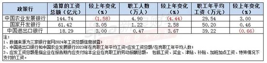 近期,多家银行披露了2024年度职工工资情况。 从薪酬表现看,三家政策性银行年度人均薪酬分化明显。其中,国家开发银行职工年平均工 资最高,为50.2万元;中国进出口银行较上年微降,为39.22万元;中国农业发展银行2024年 清算的工资总额及职工人数均有下降,但人均薪酬逆势上涨,增至29.54万元。此外,国有 大行中的工行、农行、中行、建行、交行也披露了2024工资分配信息,人均薪酬均超23万 元,交行在五大行中排名首位,达31.64万元。 此外,上述银行的职工队伍普遍呈现扩张之势,2024年仅中国农业发展银行和工商银行职工 人数缩减,其他均较上年增加,整体来看,中国进出口银行涨幅超3.6%;国家开发银行和 交通银行均超2.5%。 国开行2024人均薪酬超50万, 进出口银行微降 | 政策行 | 清算的工资 | 较上年变化 | 职工人数 | 较上年变化 | In REFER | 技 上年变化 | | --- | --- | --- | --- | --- | --- | --- | | 总额(亿元) | | %) | (万人) | (%) | 工资(万元) | (%) | | 中国农业发展银行 | 144.7 ...