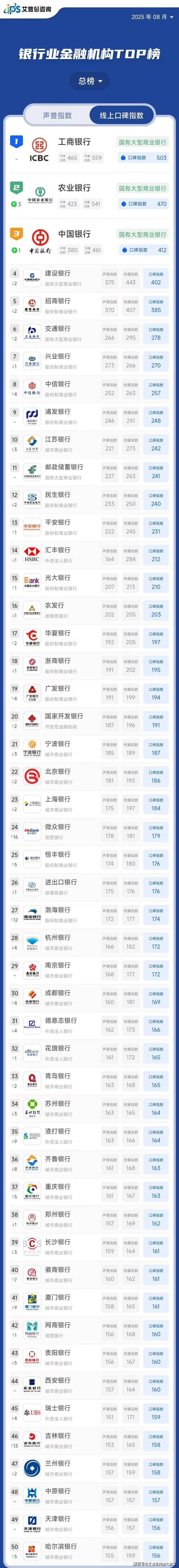 舆情指数|2025年08月中国银行业金融机构线上口碑指数TOP50