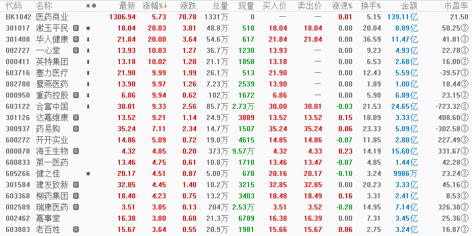 更深层次的动力,则源于行业格局的深刻变革。经历前期的快速扩张后,医药零售行业正从"野蛮生长"步入"精耕细作"的整合阶 段。数据显示,尽管实体药店总数一度突破70万家,但市场竞争已趋于白热化,部分经营不善的中小连锁药店开始退出市场。自 2024年第四季度以来,行业门店数量已连续两个季度呈现净减少态势。 展望未来,行业龙头的增长路径已清晰可见,即"内生+外延"双轮驱动。一方面,通过优化产品结构、提升服务质量和运营效率,实 现同店增长的"内生性"动力;另一方面,通过并购整合,吸纳优质门店资源,扩大市场份额的"外延式"扩张。目前,部分行业龙头 的直营门店数量约1万家,占行业总数比例仍低,行业格局变化仍处于早期阶段,集中度提升的主线将长期存在。 【环球网消费综合报道】12月18日,A股医药商业板块强势崛起,领涨两市。截至收盘,板块整体上涨5.73%,华人健康20CM涨 停,漱玉平民上涨20.03%,一心堂、英特集团、塞力医疗、重药控股等多股涨停,板块内呈现普涨格局。 这轮行情的背后,是市场对医药商业行业长期增长逻辑的重新认可。在近期公众健康意识提升的背景下,相关药品及健康产品的市 场需求得到提振,为零售药店等终端渠道带 ...
