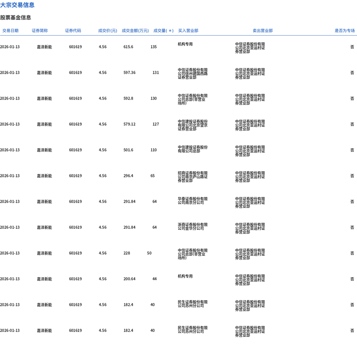 1月13日,嘉泽新能大宗交易成交1000万股,成交额4560万元,占当日总成交额的5.14%,成交价4.56 元,较市场收盘价5.01元折价8.98%。 | 交易日期 | 证券简称 | 证券代码 | | | 成交价(元) 成交金额(万元) 成交量(*) 买入营业部 | | 类出营业部 | 是否为专场 | | --- | --- | --- | --- | --- | --- | --- | --- | --- | | 2026-01-13 | 嘉泽新能 | 601619 | 4.56 | 615.6 | 135 | 机构专用 | HE SEREE | 종 | | 2026-01-13 | 息泽新能 | 619109 | 4.56 | 597.36 | 131 | | Hasser | 190 | | 2026-01-13 | 嘉泽新能 | 601619 | 4.56 | 592.8 | 130 | | 2000 | 路 | | 2026-01-13 | 直泽新能 | GOTETA | 4.56 | 579.12 | 127 | | 125 2017 | KA | | 2026-01-13 | 嘉泽新能 | 6 ...