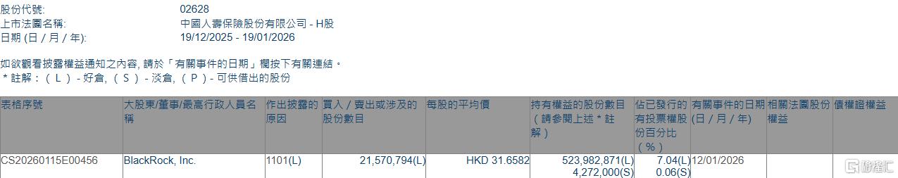 核心事件 - BlackRock, Inc 于2026年1月12日增持中国人寿H股 涉资约6.83亿港元 [1] - 此次增持后 BlackRock, Inc 对中国人寿H股的持股比例由6.75%上升至7.04% [1] 交易细节 - 增持股份数量为21,570,794股 [2] - 增持每股平均价格为31.6582港元 [2] - 增持后 BlackRock, Inc 持有的好仓股份总数增至523,982,871股 [1][2] - 披露日期范围为2025年12月19日至2026年1月19日 [2] 股东权益变动 - 此次权益变动属于好仓增持 [1] - 除好仓外 BlackRock, Inc 同时持有4,272,000股淡仓 占已发行股份的0.06% [2]