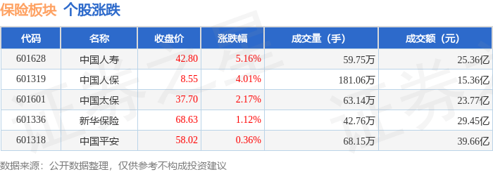 证券之星消息,10月16日保险板块较上一交易日上涨3.01%,中国人寿领涨。当日上证指数报收于 3916.23,上涨0.1%。深证成指报收于13086.41,下跌0.25%。保险板块个股涨跌见下表: | 代码 | 名称 | 收盘价 | 涨跌幅 | 成交量(手) | 成交额(元) | | | --- | --- | --- | --- | --- | --- | --- | | 601628 | 中国人寿 | 42.80 | 5.16% | 59.75万 | | 25.36 Z | | 601319 | 中国人保 | 8.55 | 4.01% | 181.06万 | | 15.36亿 | | 601601 | 中国太保 | 37.70 | 2.17% | 63.14万 | | 23.77亿 | | 601336 | 新华保险 | 68.63 | 1.12% | 42.76万 | | 29.45 Z | | 601318 | 中国平安 | 58.02 | 0.36% | 68.15万 | | 39.66亿 | | 代码 | 名称 | 主力净流入 (元) | 主力净占比 游资净流入 (元) | | 游资净占比 散户 ...