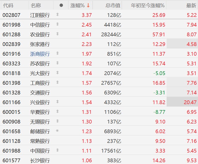 格隆汇10月22日|A股银行股涨幅进一步扩大,其中,江阴银行涨超3%,中信银行、农业银行、苏农银行、张家 港行涨超噢%。其中,农业银行14连阳,股价突破8元,再创历史新高,年内累涨近58%。 | 代码 | 名称 | | 涨幅%↓ | 总市值 | 年初至今涨幅% | | | --- | --- | --- | --- | --- | --- | --- | | 002807 | 江阴银行 | 1 | 3.37 | 128亿 | 25.69 | 5.22 | | 601998 | 中信銀行 | 1 | 2.45 | 4418亿 | 15.95 | 7.94 | | 601288 | 农业银行 | 1 | 2.41 | 28244 乙 | 57.91 | 8.07 | | 002839 | 张家港行 | | 2.23 | 112亿 | 12.29 | 4.58 | | 601916 | 浙商银行 | 1 | 1.97 | 851亿 | 11.37 | 3.10 | | 603323 | 苏农银行 | 1 | 1.92 | 107亿 | 15.74 | 5.31 | | 601818 | 光大银行 | 1 | 1.7 ...