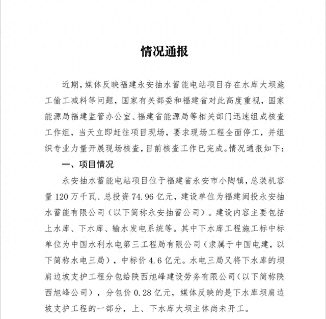 福建永安抽水蓄能电站项目被指偷工减料,官方通报