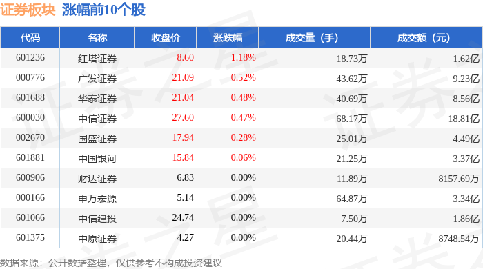 从资金流向上来看,当日证券板块主力资金净流出11.38亿元,游资资金净流入1.93亿元,散户资金净流 入9.45亿元。证券板块个股资金流向见下表: 证券之星消息,11月26日证券板块较上一交易日下跌0.23%,锦龙股份领跌。当日上证指数报收于 3864.18,下跌0.15%。深证成指报收于12907.83,上涨1.02%。证券板块个股涨跌见下表: | 代码 | 名称 | 收盘价 | 涨跌幅 | 成交量(手) | 成交额(元) | | | --- | --- | --- | --- | --- | --- | --- | | 601236 | 红塔证券 | 8.60 | 1.18% | 18.73万 | | 1.62亿 | | 000776 | 广发证券 | 21.09 | 0.52% | 43.62万 | | 9.23亿 | | 601688 | 华泰证券 | 21.04 | 0.48% | 40.69万 | | 8.56亿 | | 600030 | 中信证券 | 27.60 | 0.47% | 68.17万 | | 18.81亿 | | 002670 | 圖盛证券 | 17.94 | 0.28% | 25. ...