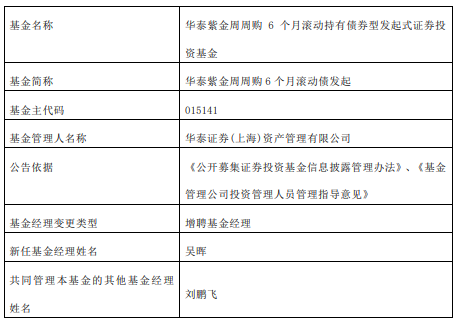 华泰紫金周周购6个月滚动债发起增聘吴晖