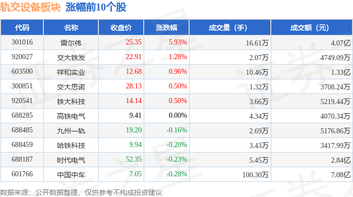 轨交设备板块市场表现 - 2024年1月12日,轨交设备板块整体上涨1.57%,表现强于大盘,当日上证指数上涨1.09%,深证成指上涨1.75% [1] - 板块内个股普涨,领涨股为朗进科技,其股价收盘于23.72元,单日涨幅达12.15% [1] - 板块成交活跃,多只个股成交量显著,例如神州高铁成交180.79万手,众合科技成交117.21万手 [1] 板块个股涨跌详情 - 朗进科技涨幅最高为12.15%,成交额2.46亿元 [1] - 今创集团上涨6.83%,收盘价17.82元,成交额2.55亿元 [1] - 众合科技上涨6.18%,收盘价9.79元,成交额11.46亿元 [1] - 神州高铁上涨4.22%,收盘价3.21元,成交额5.72亿元 [1] - 天宜上佳(文中为“天直新材”,疑为笔误)上涨3.58%,收盘价8.69元,成交额5.47亿元 [1] - 必得科技上涨3.48%,收盘价45.20元,成交额2.10亿元 [1] - 祥和实业上涨2.87%,收盘价12.56元,成交额1.17亿元 [1] - 永贵电器(文中为“永慧电器”,疑为笔误)上涨2.52%,收盘价19.09元,成交额4.25亿元 [1] - 通业科技上涨2.40%,收盘价25.98元,成交额8220.16万元 [1] - 中国通号上涨2.16%,收盘价5.68元,成交额2.54亿元 [1] 板块资金流向 - 当日轨交设备板块整体获得主力资金净流入8502.4万元,而游资资金净流出4619.32万元,散户资金净流出3883.08万元 [1] - 中国中车是主力资金流入的核心标的,主力净流入8134.75万元,主力净占比达11.22% [2] - 神州高铁获得主力净流入6611.07万元,主力净占比为11.56% [2] - 众合科技获得主力净流入6539.01万元,主力净占比为5.71% [2] - 必得科技获得主力净流入2947.05万元,主力净占比高达14.05% [2] - 今创集团获得主力净流入2498.64万元,主力净占比为9.79% [2] - 朗进科技获得主力净流入1623.18万元,主力净占比6.61%,同时是少数获得游资净流入(1089.72万元)的个股 [2] - 哈铁科技主力净流入601.81万元,但其主力净占比高达17.78%,显示资金集中度较高 [2]