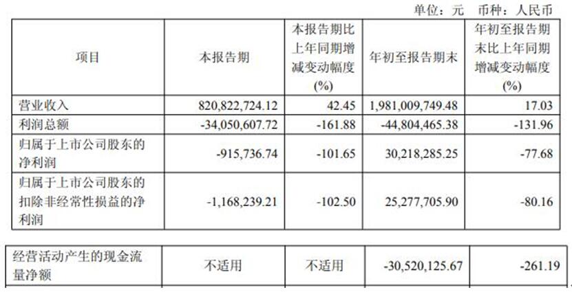 | 经营活动产生的现金流 | 不适用 | 不适用 | -30.520.125.67 | -261.19 | | --- | --- | --- | --- | --- | | 量净额 | | | | | 中国经济网北京11月20日讯 森林包装(605500.SH)近日发布2025年第三季度报告。今年前三季度,公司实现营业收 入19.81亿元,同比增长17.03%;归属于上市公司股东的净利润3021.83万元,同比下降77.68%;归属于上市公司股东 的扣除非经常性损益的净利润2527.77万元,同比下降80.16%;经营活动产生的现金流量净额为-3052.01万元,上年同 期为1893.45万元。 | | | | 项目 | 本报告期 | 本报告期比 上年同期增 | 年初至报告期末 | 年初至报告期 末比上年同期 | | --- | --- | --- | --- | --- | | | | 减变动幅度 | | 增减变动幅度 | | | | (%) | | (%) | | 营业收入 | 820,822,724.12 | 42.45 | 1.981.009.749.48 | 17.03 | | 利润总额 | -3 ...