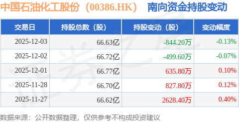 中国石油化工股份(00386.HK):12月3日南向资金减持844.2万股
