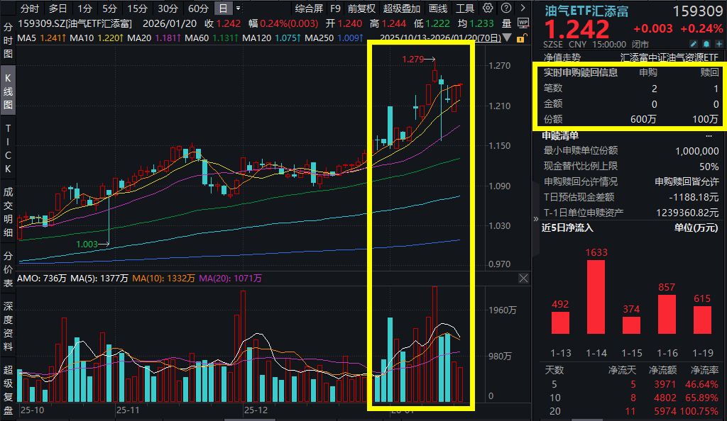 1月20日,A股市场探底回升,沪指尾盘险些翻红。截至收盘,油气ETF汇添富(159309)收涨0.24%,资金持续涌入油气板块,油气ETF汇添富 (159309)全天再度吸金超600万元,加上今天已连续6日吸金超4500万元! 【油气ETF汇添富(159309)标的指数前十大成分股】 | 序号 | 代码 | 名称 | 申万一级行业 | 涨跌幅 | 估息科重 | | --- | --- | --- | --- | --- | --- | | 1 | 002353 | 杰瑞股份 | 机械设备 | -2.40% | 11.23% | | 2 | 600938 | 中国酒店 | 石油石化 | 0.71% | 9.25% | | 3 | 601857 | 甲国石油 | 石油石化 | 1.02% | 8.94% | | 4 | 600028 | 中国石化 | 石油白化 | 1.35% | 8.89% | | 5 | 601872 | 招商轮胎 | 交通运输 | -1.75% | 8.03% | | 6 | 600026 | 中远海能 | 交通运输 | -0.21% | 5.29% | | 7 | 600256 | 广汇能 ...