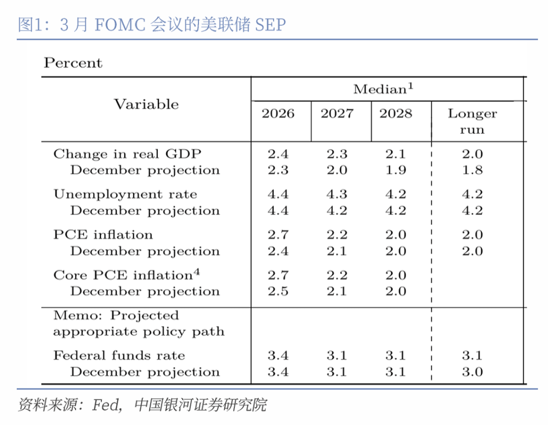 美联储3月FOMC会议核心观点 - 会议整体符合预期,但鲍威尔发布会传递鹰派信号,市场短期需进一步定价通胀,长期需关注经济下行担忧 [1] - 美联储在经济前景不明朗的背景下“雾中开车”,短期按兵不动,更担忧通胀反复,同时警惕通胀预期抬头或就业连续恶化 [2] - 高油价可能产生“两阶段”冲击:短期未被充分定价的能源通胀将压制降息预期和风险偏好;长期若持续高位将拖累经济并最终引发降息 [7] - 当前无需担忧重演2022年连续加息情形,因缺乏当时的多重条件(如过剩流动性、劳动市场巨大缺口),美联储更易将能源冲击视为一次性 [8] - 公司坚持认为,随着通胀偏高开始冲击经济,美联储年内会有1次以上降息,加息概率很低,最乐观情况下仍有3次降息 [1][8] FOMC声明与SEP(经济预测摘要)要点 - FOMC声明变化有限:利率维持3.75%-3.50%不变,RMP规模未调整;声明将失业率描述从“显现企稳迹象”改为“近几个月变化很小”,并增加对中东局势不确定性的表述 [1][3] - 反对不降息的委员人数从上次会议的两人减少至仅米兰(Miran)一人,此前鸽派的沃勒(Waller)加入暂时不降息阵营 [1][3] - SEP预测温和上调:2026年PCE与核心PCE通胀预期从2.4%和2.5%均上调至2.7%;2027年PCE通胀略上调至2.2% [3][11] - 2026年实际GDP增速预测从2.3%小幅上调至2.4%,2027年上调至2.3%;失业率预测基本稳定,2026年维持4.4%,2027年微调至4.3% [3][11] - 点阵图仍指向2026年内有一次降息,联邦基金利率中值预测2026年为3.4%,2027年为3.1% [1][11][14] 鲍威尔发布会传递的鹰派信号 - 鲍威尔弱化了近期劳动市场下行的风险,并强调需要观察通胀预期是否稳定,暗示短期降息并不急迫 [4][5] - 关于通胀,鲍威尔虽倾向于将能源通胀视为一次性冲击,但担忧通胀预期出现脱锚,需观察能源价格向核心价格的传导 [5] - 鲍威尔提及“留任理事”的可能性,以反击特朗普司法部的刑事调查,这可能弱化2026年美联储理事会更鸽派的结构,不利于新主席沃什(Warsh)推动降息 [6] 市场反应与资产价格表现 - 受中东局势升级、美国2月PPI超预期(同比升至3.4%,环比0.7%)及鹰派FOMC信号冲击,降息预期和风险资产全面弱化 [9] - CME联邦基金利率期货显示交易者定价2026年没有任何降息,会议前定价为10月有1次降息 [9] - 美国三大股指全面下跌:标普500跌1.36%,纳指跌1.46%,道指跌1.63% [9] - 债券收益率上行:10年期美债收益率升6.46个基点至4.265%,2年期升9.72个基点至3.771% [9] - 大宗商品:伦金大跌3.86%至4813.533美元/盎司;布油涨至105.06美元/桶,WTI原油涨至99.05美元/桶;美元指数走强至100.2981 [9] 经济与政策背景分析 - 美联储面临短期滞胀与长期衰退风险上升的两难局面:3月CPI预计向3%靠拢体现能源价格压力,同时劳动市场新增就业三月均值基本处于零增长状态 [2] - 地缘政治方面,中东局势因美国攻击伊朗能源设施并引发报复而升级,能源价格的外生性冲击难以预测 [2] - 政策方面,新任美联储主席沃什希望去监管和降息,但短期受通胀反弹阻碍,大规模缩表在回购市场流动性不算充裕的情况下也难以开启 [2] - 劳动市场下行压力仍然存在,新增非农就业三个月移动平均值显示增长乏力 [18][19] - 经济在不确定性和偏高利率下未展示出周期性回升势头,不含进出口、政府和库存的GDP增长疲软 [22][23]