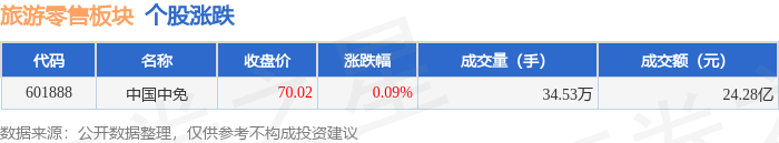 | 代码 名称 主力净流入(元) 主力净占比 游资净流入(元) 游资净占比 散户净占比 | | | | | | | --- | --- | --- | --- | --- | --- | | 601888 中国中免 9425.77万 | 3.88% | -6128.68万 | -2.52% | -3297.09万 | -1.36% | | 20 | | | | | | | 代码 | 名称 | 收盘价 | 涨跌幅 | 成交量(手) | | 成交额(元) | | | --- | --- | --- | --- | --- | --- | --- | --- | | 601888 | 中国中免 | 70.02 | 0.09% | | 34.53万 | | 24.28 Z | 从资金流向上来看,当日旅游零售板块主力资金净流入9425.77万元,游资资金净流出6128.68万元,散户 资金净流出3297.09万元。旅游零售板块个股资金流向见下表: 证券之星消息,10月17日旅游零售板块较上一交易日上涨0.09%,中国中免领涨。当日上证指数报收于 3839.76,下跌1.95%。深证成指报收于12688.94,下跌3.0 ...