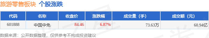 | 代码 | 名称 | 收盘价 | 涨跌幅 | 成交量(手) | | 成交额(元) | | | --- | --- | --- | --- | --- | --- | --- | --- | | 601888 | 中国中免 | 84.46 | 6.87% | | 73.63万 | | 60.94亿 | 证券之星消息,12月1日旅游零售板块较上一交易日上涨6.87%,中国中免领涨。当日上证指数报收于 3914.01,上涨0.65%。深证成指报收于13146.72,上涨1.25%。旅游零售板块个股涨跌见下表: 从资金流向上来看,当日旅游零售板块主力资金净流入3.44亿元,游资资金净流入1.95亿元,散户资金净 流出5.4亿元。旅游零售板块个股资金流向见下表: | 代码 名称 主力净流入 (元) 主力净占比 游资净流入 (元) 游资净占比 散户净占比 | | | | | | | --- | --- | --- | --- | --- | --- | | 3.44亿 5.65% | 601888 中国中免 LLL LED L LEWILLI LEN LE MIN - MIN LL L L L L PROLL - IL ...