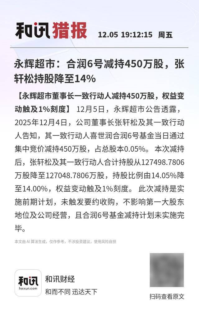 和讯财经 和而不同 迅达天下 扫码查看原文 永辉超市:合润6号减持450万股,张 轩松持股降至14% 【永辉超市董事长一致行动人减持450万股,权益变 动触及1%刻度】 12月5日,永辉超市公告透露, 2025年12月4日,公司董事长张轩松及其一致行动 人告知,其一致行动人喜世润合润6号基金当日通过 集中竞价减持450万股,占总股本0.05%。本次减持 后,张轩松及其一致行动人合计持股从127498.7806 万股降至127048.7806万股,持股比例由14.05%降 至14.00%,权益变动触及1%刻度。 此次减持是实 施前期计划,未触发要约收购,不影响第一大股东 地位及公司经营,且合润6号基金减持计划未实施完 毕。 本文由 Al 算法生成,仅作参考,不涉投资建议,使用风险自担 【永辉超市董事长一致行动人减持450万股,权益变动触及1%刻度】12月5日,永辉超市公告透露, 2025年12月4日,公司董事长张轩松及其一致行动人告知,其一致行动人喜世润合润6号基金当日通过集 中竞价减持450万股,占总股本0.05%。 本次减持后,张轩松及其一致行动人合计持股从127498.7806万 股降至127048.78 ...