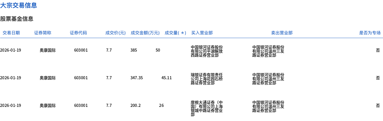| 交易日期 | 证券简称 | 证券代码 | | | 成交价(元) 成交金额(万元) 成交量(*) 买入营业部 | | 卖出营业部 | | --- | --- | --- | --- | --- | --- | --- | --- | | 2026-01-19 | 奥康国际 | 603001 | 7.7 | 382 | 20 | | 中国银河证券股份 | | 2026-01-19 | 奥康国际 | 603001 | 7.7 | 347.35 | 45.11 | 公司上意見論空房 | 中国城河北分放力 | | 2026-01-19 | 奥康国际 | 603001 | 7.7 | 200.2 | 26 | | | 1月19日,奥康国际大宗交易成交121.11万股,成交额932.55万元,占当日总成交额的4.02%,成交价7.7元,较市场收盘价9.41元折价18.17%。 ...