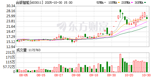 10月31日,合锻智能(维权)盘中下跌2.02%,截至10:23,报24.24元/股,成交7.45亿元,换手率 6.19%,总市值119.85亿元。 资金流向方面,主力资金净流入88.12万元,特大单买入6501.31万元,占比8.72%,卖出6000.48万元, 占比8.05%;大单买入1.37亿元,占比18.44%,卖出1.42亿元,占比18.99%。 合锻智能今年以来股价涨253.87%,近5个交易日跌1.30%,近20日涨20.90%,近60日涨59.06%。 截至9月30日,合锻智能股东户数7.80万,较上期增加10.01%;人均流通股6340股,较上期减少9.10%。 2025年1月-9月,合锻智能实现营业收入16.73亿元,同比增长14.03%;归母净利润-4432.77万元,同比 减少677.25%。 分红方面,合锻智能A股上市后累计派现1.57亿元。近三年,累计派现0.00元。 机构持仓方面,截止2025年9月30日,合锻智能十大流通股东中,永赢睿信混合A(019431)位居第三 大流通股东,持股930.45万股,为新进股东。永赢稳健增强债券A(014088)位居第四大流通股东,持 股573 ...