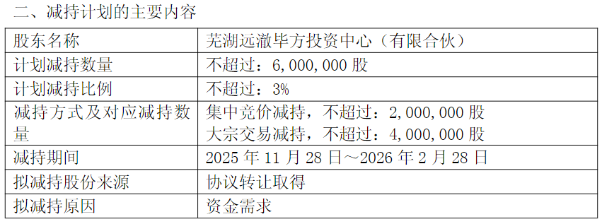 公司股东持股及变动情况 - 股东芜湖远澈毕方投资中心(有限合伙)持有公司股份14,903,700股,占公司总股本的7.45% [2] - 毕方投资计划通过集中竞价或大宗交易方式减持股份,减持数量不超过600万股,即不超过公司总股本的3% [2] - 减持计划将自公告披露之日起15个交易日后的3个月内实施 [2]