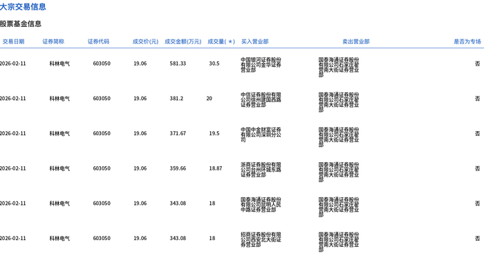大宗交易概况 - 2026年2月11日,科林电气发生大宗交易,总成交124.87万股,总成交金额2380.02万元,占该股当日总成交额的21.98% [1] - 本次大宗交易成交均价为19.06元,较当日市场收盘价20.95元折价9.02% [1] 交易明细分析 - 当日大宗交易共分6笔完成,成交价格均为19.06元 [2] - 单笔成交金额分布在343.08万元至581.33万元之间,单笔成交量在18万股至30.5万股之间 [2] - 所有交易记录均未显示具体的买入与卖出营业部信息 [2]