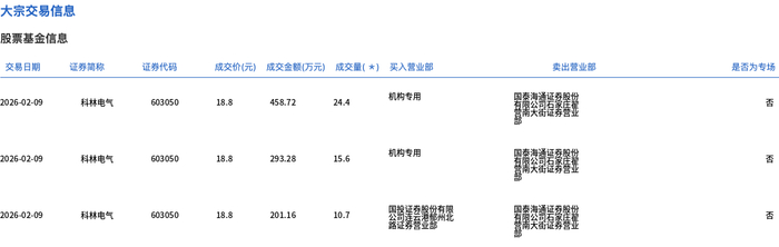大宗交易概况 - 2026年2月9日,科林电气发生大宗交易,成交50.7万股,成交总额为953.16万元,占该股当日总成交额的14.36% [1] - 本次大宗交易的成交价格为每股18.8元,较当日市场收盘价20.58元折价8.65% [1] 交易明细分析 - 当日共发生三笔大宗交易,成交价格均为每股18.8元 [2] - 第一笔成交24.4万股,成交金额458.72万元,买入营业部为机构专用 [2] - 第二笔成交15.6万股,成交金额293.28万元,买入营业部为机构专用 [2] - 第三笔成交10.7万股,成交金额201.16万元 [2]