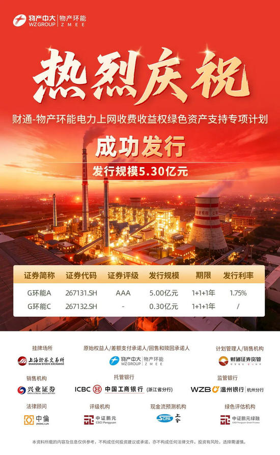 物产环能(603071)官方公众号显示,为积极响应"双碳"目标、深化绿色金融创新,公司于12月12日成功 发行"财通-物产环能电力上网收费收益权绿色资产支持专项计划"。物产环能表示,这是公司首次进军 债券市场,发行规模5.3亿元人民币,市场反响热烈,发行成效显著。 物产环能表示,本次发行聚焦绿色能源,盘活优质资产。本次专项计划的底层基础资产,是物产环能旗 下子公司污泥及生物质发电机组的电力上网收费收益权。这些热电联产项目运营稳定,现金流持续且可 预测,其绿色属性与国家能源结构转型的战略方向高度契合。通过资产证券化这一创新金融工具,公司 成功将未来的绿色现金流转化为当下的发展资本,有效盘活了存量资产,优化了资产负债结构,为继续 扩大清洁能源领域投资提供了有力的金融支撑。 本次发行采用了"1+1+1"期限结构设计,显著增强了产品的灵活性。尽管近期债券市场存在一定波动, 但凭借突出的绿色主题、优质的资产基础和公司良好的市场声誉,本次专项计划仍获得了银行、券商等 众多专业投资机构的积极认购,最终发行利率低至1.75%,这不仅体现了资本市场对优质绿色金融资产 的认可,也降低了公司的融资成本,实现了经济效益与环境效益的协 ...