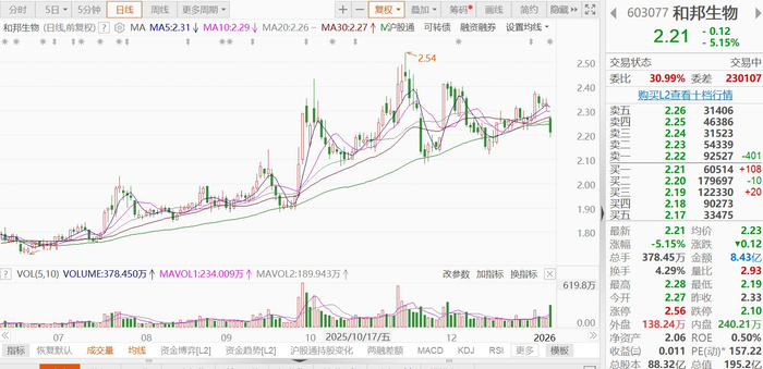 A股异动 | 和邦生物放量跌逾5%,2025年度业绩预亏