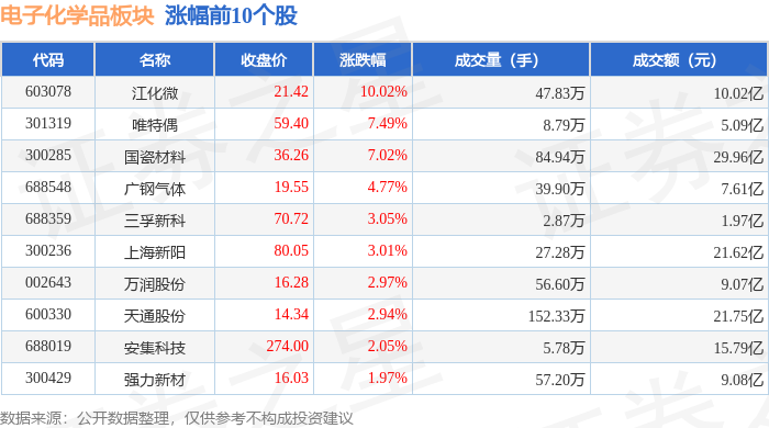 从资金流向上来看,当日电子化学品板块主力资金净流出1.43亿元,游资资金净流入8841.02万元,散户 资金净流入5486.88万元。电子化学品板块个股资金流向见下表: 证券之星消息,1月12日电子化学品板块较上一交易日上涨1.46%,江化微领涨。当日上证指数报收于 4165.29,上涨1.09%。深证成指报收于14366.91,上涨1.75%。电子化学品板块个股涨跌见下表: | 代码 | 名称 | 收盘价 | 涨跌幅 | 成交量(手) | 成交额(元) | | | --- | --- | --- | --- | --- | --- | --- | | 603078 | 江化微 | 21.42 | 10.02% | 47.83万 | | 10.02 乙 | | 301319 | 唯特偶 | 59.40 | 7.49% | 8.79万 | | = 5.09亿 | | 300285 | 圖瓷材料 | 36.26 | 7.02% | 84.94万 | | 29.96亿 | | 688548 | 广钢气体 | 19.55 | 4.77% | - 39.90万 | | 7.61亿 | | 688389 | 三平新科 | ...