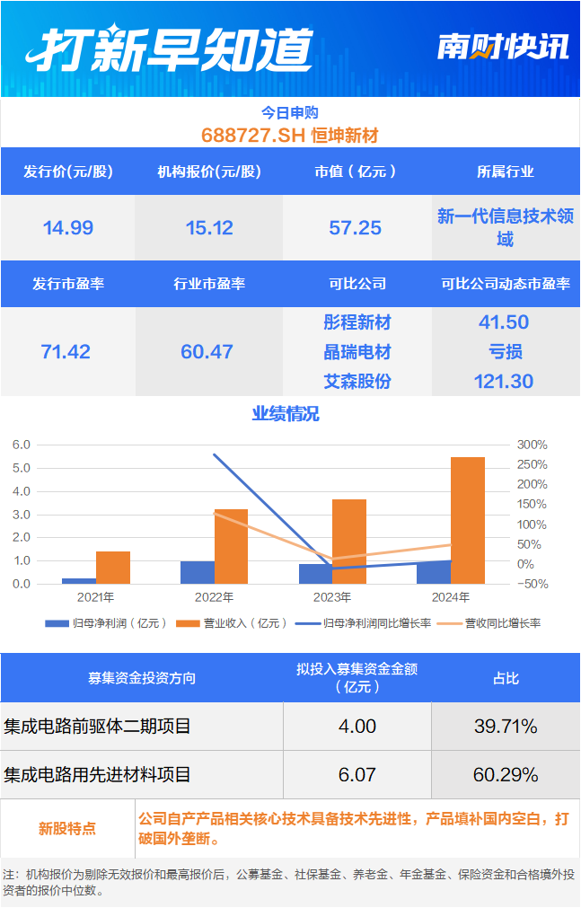 11月7日,有两只新股申购,分别是科创板的恒坤新材(688727.SH),以及创业板的南网数字 (301638.SZ);另有两只新股上市,为沪市主板的德力佳(603092.SH),以及北交所的中诚咨询 (920003.BJ)。 两只新股申购 恒坤新材致力于集成电路领域关键材料的研发与产业化应用,是境内少数具备12英寸集成电路晶圆制造 关键材料研发和量产能力的创新企业之一,主要从事光刻材料和前驱体材料等产品的研发、生产和销 售。 招股书显示,恒坤新材自产的主要产品包括SOC、BARC、KrF光刻胶、i-Line光刻胶和TEOS前驱体材 料。2022年至2024年,公司自产产品销售收入分别为12357.89万元、19058.84万元和34418.93万元,占 主营业务收入的比例分别为38.94%、52.72%和63.77%,收入规模和占比逐年上升。 客户方面,恒坤新材客户集中度较高,主要是系由于下游晶圆制造行业集中度较高所致,主要客户中, 客户A、客户B、客户C均系知名存储芯片制造厂商,客户D、客户E等均系知名逻辑芯片生产厂商。根 据弗若斯特沙利文统计,客户A、客户B、客户C、客户D以及客户E均系2023年境内产 ...