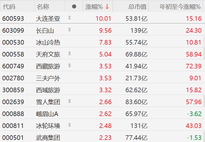 格隆汇10月20日|A股市场冰雪经济概念股午后拉升,其中,长白山(603099)拉升触及涨停,大连圣亚 (600593)此前涨停,冰山冷热涨近8%,天府文旅涨5%,西藏旅游(600749)、三夫户外(002780)、西域旅 游涨超3%。 (责任编辑:宋政 HN002) | 代码 | 名称 | ● | 涨幅% ↓ | 总市值 | 年初至今涨幅% | | --- | --- | --- | --- | --- | --- | | 600593 | 大连圣亚 | 主 | 10.01 | 53.81亿 | 15.16 | | 603099 | 长白川 | 1 | 9.56 | 139亿 | 24.30 | | 000530 | 冰山冷热 | | 7.83 | 55.74亿 | 10.81 | | 000558 | 天府文旅 | 1 | 5.04 | 69.88亿 | 58.94 | | 600749 | 西藏旅游 | 1 | 3.53 | 41.94亿 | 72.39 | | 002780 | 三夫户外 | | 3.53 | 21.73亿 | 9.01 | | 300859 | 西域旅游 | | 3.32 | 62. ...