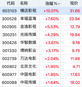 A股影视股集体走强,横店影视涨停,幸福蓝海涨超7%