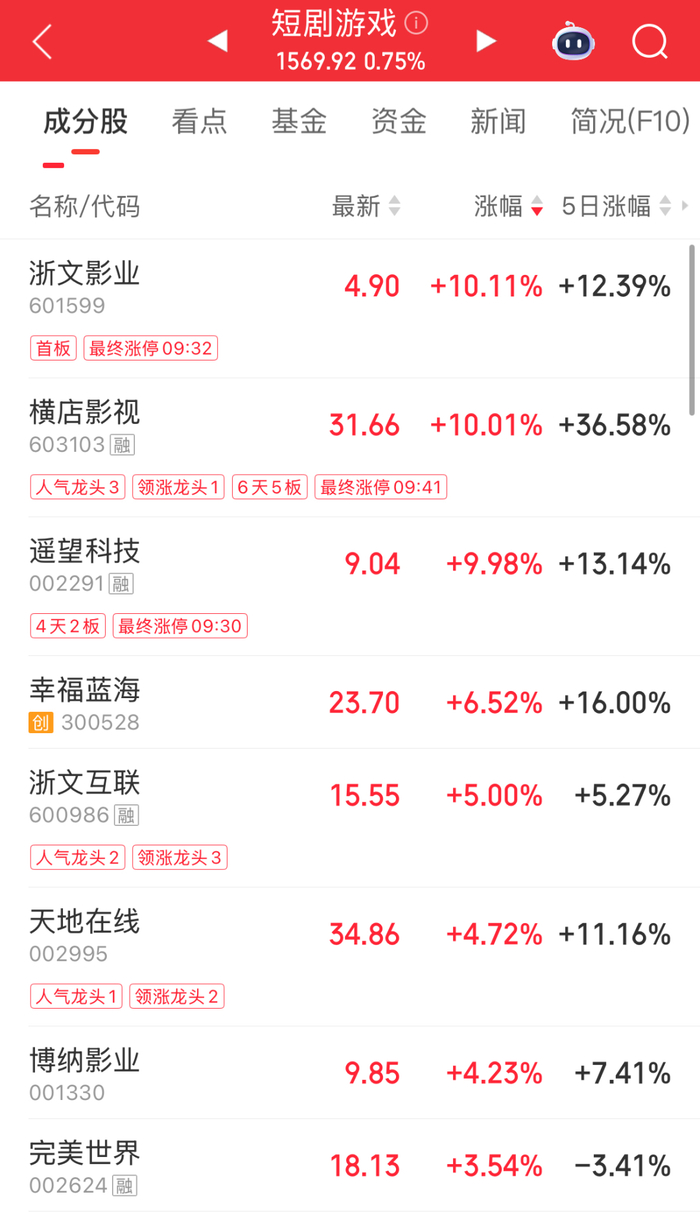 短剧概念板块市场表现 - 截至2月5日13:20,短剧概念板块走强,多只个股表现强势 [1] - 浙文影业、横店影视、天地在线、遥望科技四只个股涨停 [1] - 幸福蓝海、宣亚国际、博纳影业等个股涨幅居前 [1]