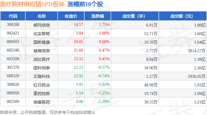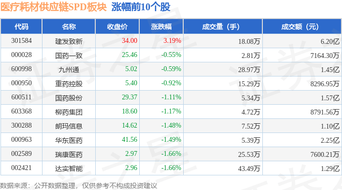 证券之星消息,11月19日医疗耗材供应链SPD板块较上一交易日下跌1.42%,艾隆科技领跌。当日上证指 数报收于3946.74,上涨0.18%。深证成指报收于13080.09,下跌0.0%。医疗耗材供应链SPD板块个股涨跌 见下表: | 代码 | 名称 | 收盘价 | 涨跌幅 | 成交量(手) | 成交额(元) | | --- | --- | --- | --- | --- | --- | | 301584 | 建发致新 | 34.00 | 3.19% | 18.08万 | 6.20亿 | | 000028 | 国药一致 | 25.46 | -0.55% | 2.81万 | 7164.30万 | | 600998 | 九州通 | 5.02 | -0.59% | 28.97万 | 1.45亿 | | 000950 | 重药控股 | 5.40 | -0.92% | 15.29万 | 8296.95万 | | 600511 | 国药股份 | 29.37 | -1.11% | 5.34万 | 1.57亿 | | 603368 | 柳药集团 | 18.60 | -1.17% | 4.72万 | 8791.56万 | | ...