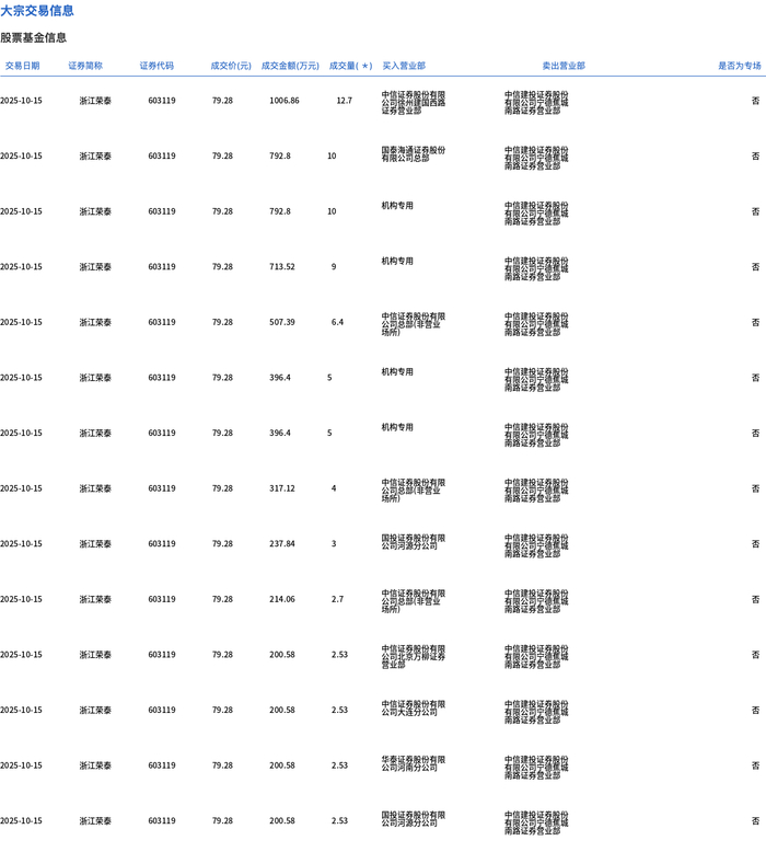 | 交易日期 | 证券简称 | 证券代码 | | | 成交价(元) 成交金额(万元) 成交量(*) 买入营业部 | | 类出营业部 | 是否为专场 | | --- | --- | --- | --- | --- | --- | --- | --- | --- | | 2025-10-15 | 浙江荣泰 | 611809 | 79.28 | 1006.86 | 12.7 | | 12 | 종 | | 2025-10-15 | 浙江资源 | 603119 | 79.28 | 792.8 | 10 | France of the D | | Ka | | 2025-10-15 | 浙江荣泰 | 603119 | 79.28 | 792.8 | 10 | 机构专用 | | 播 | | 2025-10-15 | 浙江荣泰 | 611809 | 79.28 | 713.52 | ம | 机构专用 | | KA | | 2025-10-15 | 浙江荣泰 | 603119 | 79.28 | 507.39 | 6.4 | SHERE START | | 로 | | 2025-10-15 | 深江景泰 | 603119 | ...