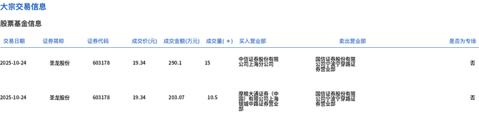 大宗交易概况 - 2025年10月23日,圣龙股份发生大宗交易,成交量为130.89万股,成交金额为2697.62万元,占当日总成交额的8.39% [1] - 成交价格为20.61元,较当日市场收盘价20.8元折价0.91% [1] 交易细节 - 交易证券为圣龙股份,证券代码603178 [2] - 买入方营业部为机构专用 [2] - 卖出方营业部为国信证券股份有限公司宁波宇穿路证券营业部 [2]