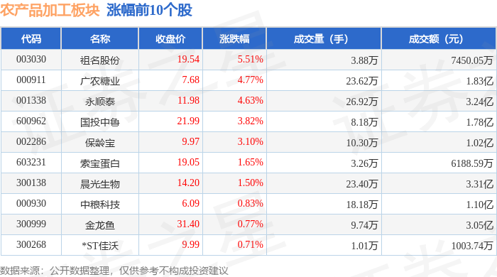 证券之星消息,10月15日农产品加工板块较上一交易日上涨0.8%,祖名股份领涨。当日上证指数报收于 3912.21,上涨1.22%。深证成指报收于13118.75,上涨1.73%。农产品加工板块个股涨跌见下表: | 代码 | 名称 | 主力净流入(元) | 主力净占比 游资净流入 (元) | | 游资净占比 散户净流入(元) | | 散户净占比 | | --- | --- | --- | --- | --- | --- | --- | --- | | 001338 | 永顺泰 | 6000.73万 | 18.52% | -1938.92万 | -5.99% | -4061.80万 | -12.54% | | 000911 广农糖业 | | 2878.94万 | 15.73% | -433.39万 | -2.37% | -2445.55万 | -13.36% | | 000930 中粮科技 | | 1198.09万 | 10.85% | -542.60万 | -4.91% | -655.49万 | -5.94% | | 002286 | 保龄宝 | 710.50万 | 6.98% | 169.58万 | 1.6 ...