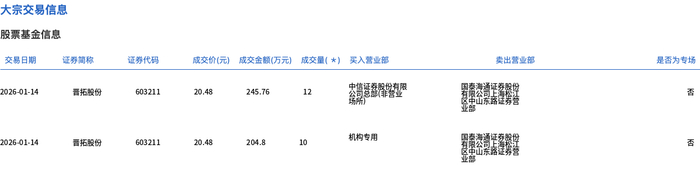 大宗交易概况 - 2026年1月14日,晋拓股份发生大宗交易,总成交22万股,总成交金额450.56万元,占该股当日总成交额的2% [1] - 大宗交易成交均价为20.48元,较当日市场收盘价22.76元折价10.02% [1] 交易明细分析 - 当日共发生两笔大宗交易,证券代码均为603211 [2] - 第一笔成交12万股,成交金额245.76万元,成交价20.48元,卖出营业部为SHERE HOSTER 15,40 [2] - 第二笔成交10万股,成交金额204.8万元,成交价20.48元,卖出方为机构专用席位 [2]