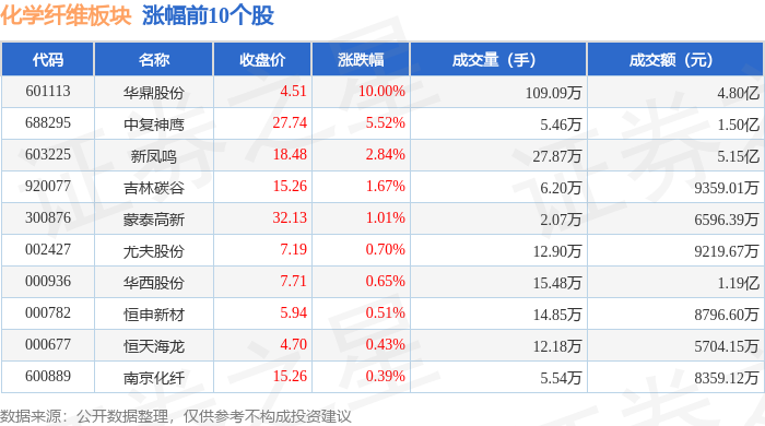 证券之星消息,11月17日化学纤维板块较上一交易日上涨0.04%,华鼎股份领涨。当日上证指数报收于 3972.03,下跌0.46%。深证成指报收于13202.0,下跌0.11%。化学纤维板块个股涨跌见下表: | 代码 | 名称 | 主力净流入(元) | 主力净占比 游资净流入(元) | | 游资净占比 散户净流入(元) | | 散户净占比 | | --- | --- | --- | --- | --- | --- | --- | --- | | 601113 | 非常服務 | 1.13 Z | 23.62% | -7035.74万 | -14.67% | -4290.76万 | -8.95% | | 688295 | 中复神鹰 | 2033.35万 | 13.56% | -371.38万 | -2.48% | -1661.96万 | -11.08% | | 603225 | 新凤鸣 | 1540.67万 | 2.99% | -2728.51万 | -5.30% | 1187.84万 | 2.31% | | 301057 | 汇隆新材 | 215.90万 | 1.14% | -978.18万 | -5.18% ...