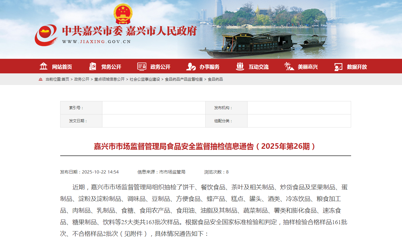 浙江省嘉兴市市场监督管理局食品安全监督抽检信息通告(2025年第26期)