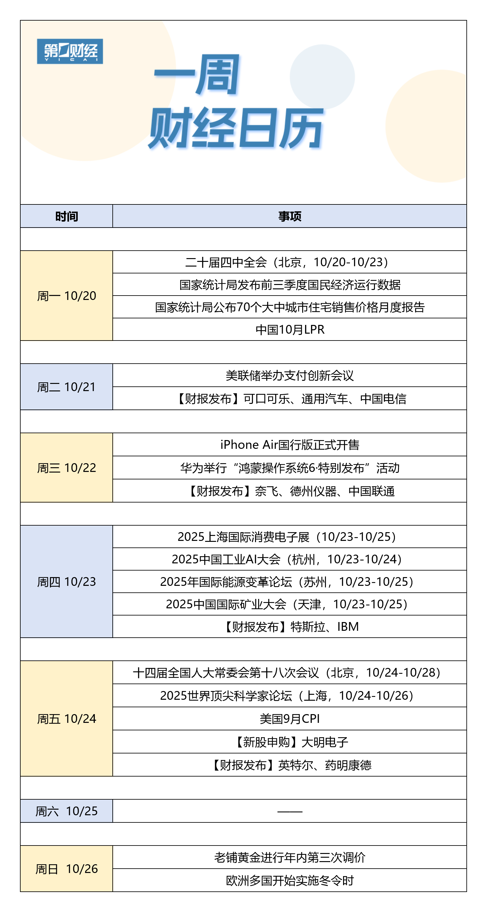 | | 2025上海国际消费电子展 (10/រ | | --- | --- | | | 2025中国工业AI大会(杭州,10, | | 周四 10/23 | 2025年国际能源变革论坛(苏州,1 | | | 2025中国国际矿业大会(天津,1( | | | 【财报发布】特斯拉、II | | | 十四届全国人大常委会第十八次会议(北 | | | 2025世界顶尖科学家论坛(上海,1 | | 周开 10/24 | 美国9月CPI | | | 【新股申购】 大明电j | | | 【财报发布】 英特尔、药明 | | 周六 10/25 | | | 周日 10/26 | 老铺黄金进行年内第三次 | | | 欧洲多国开始实施冬令 | (文章来源:第一财经) | 时间 | 事项 | | | --- | --- | --- | | 10/20 筒 | 二十届四中全会(北京,10/2( 国家统计局发布前三季度国民经 | | | | 国家统计局公布70个大中城市住宅销 中国10月LPR | | | 周二 10/21 | 美联储举办支付创新会 | | | | 【财报发布】可口可乐、通用汽车 | | | 周三 10/22 | iPho ...