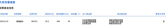 公司股价与交易表现 - 1月15日公司股价收于21.50元,单日上涨1.75% [1] - 当日发生一笔大宗交易,成交30万股,成交金额606万元,成交价20.20元较收盘价折价6.05% [1] - 近3个月内公司累计发生7笔大宗交易,总成交金额达4405.8万元 [1] - 近5个交易日公司股价累计上涨4.12% [1] 资金流向 - 近5个交易日主力资金合计净流出194.16万元 [1] 大宗交易细节 - 1月15日大宗交易的买方为方正证券股份有限公司温州黎明西路证券营业部 [1] - 1月15日大宗交易的卖方为国投证券股份有限公司嘉兴海宁海昌南路证券营业部 [1]