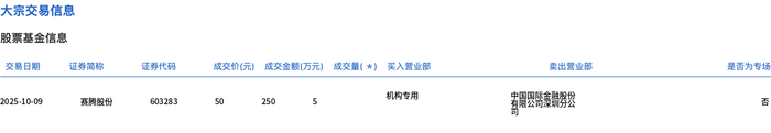 交易概况 - 10月9日赛腾股份发生大宗交易,成交5万股,成交额250万元 [1] - 该笔大宗交易成交额占公司当日总成交额的0.18% [1] - 成交价格为50元,较市场收盘价52.14元折价4.1% [1]